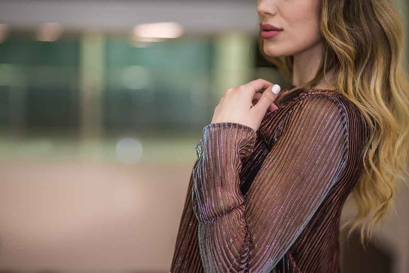 Ефетна разкроена парти рокля от бляскъв солей в кафяво - черна гама с дълги ръкави. Роклята е с подплата