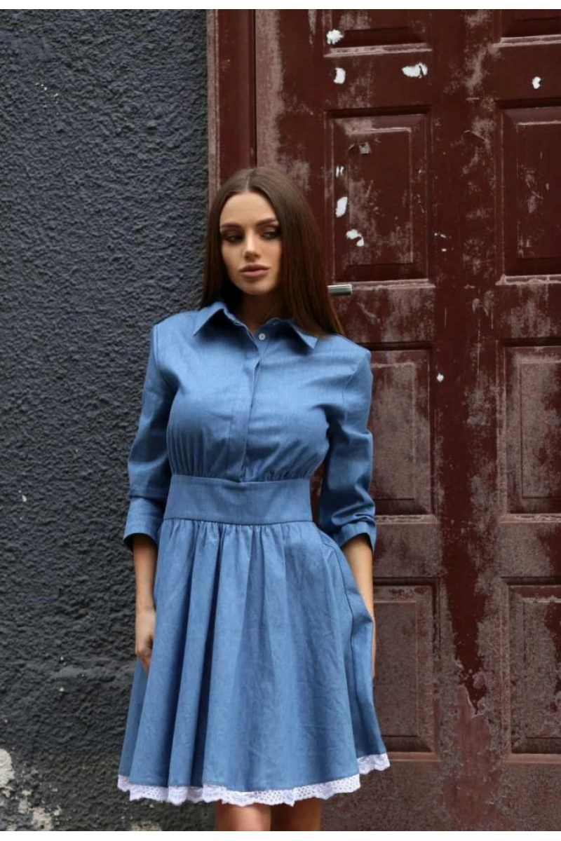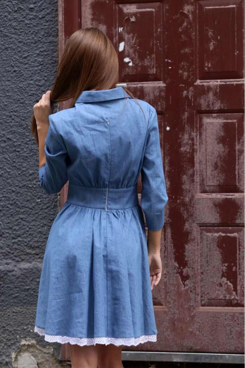 Дънкова рокля PAMELA с дантела е практична, но и романтична, и ретро, затова и е една от най-търсените рокли онлайн. Макар и от миналия век, денимът продължава да се радва на огромна популярност и може да изглежда както спортно, така и стилно. Красивият модел PAMELA от колекцията на FRINA, представлява разкроена рокля от светъл деним, с широк колан, с набор под бюста и с набор на полата. Дължината е до над коляното. Има два вида закопчаване – с дълъг скрит цип на гърба и скрито предно закопчаване с малки копчета от колана до яката. Ръкавите са широки, с дължина 7/8, без маншет. Подходяща е за всеки сезон и за всякакво време. Може да се съчетае с всякакви обувки – спортни, груби, романтични, летни или зимни. Бордът от бяла дантела на подгъва на роклята привнася женственост, великолепие, разкош и дори празнично настроение. Уникалността на нашето предложение е, че можем да правим корекции по желание на клиентите, а също така и да изработим роклята по индивидуални размери.