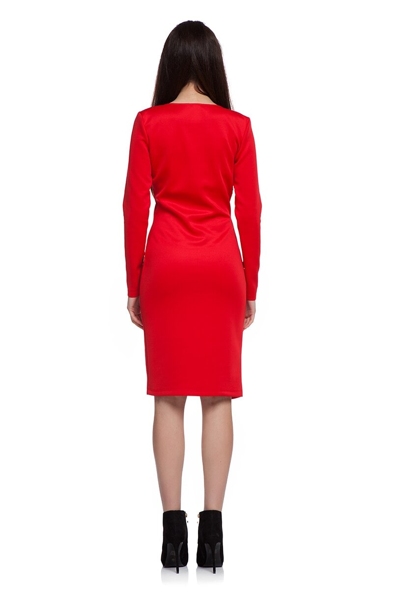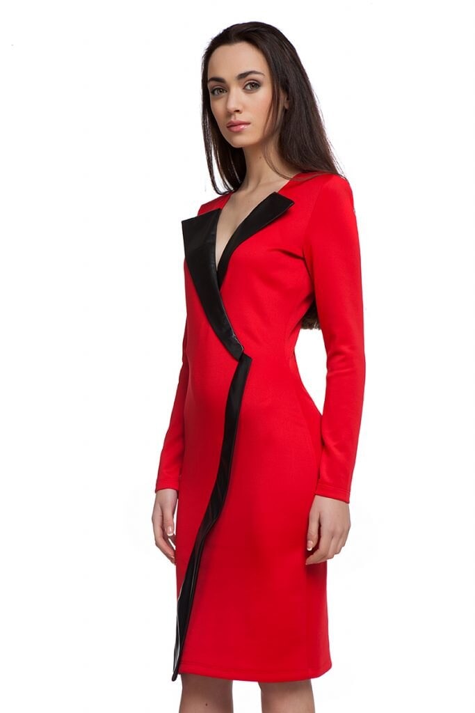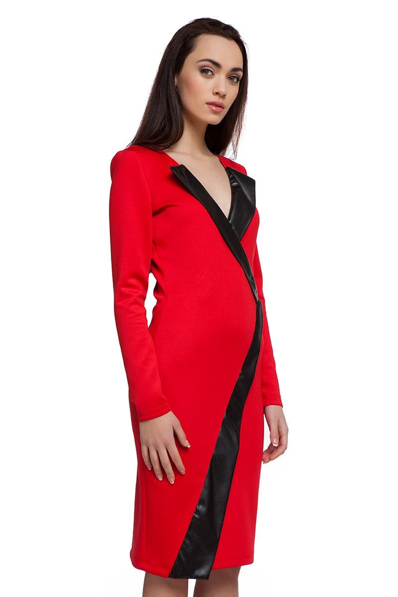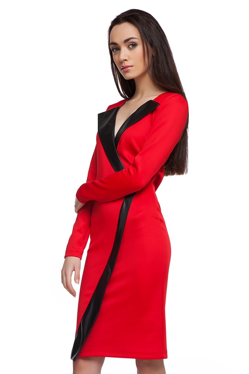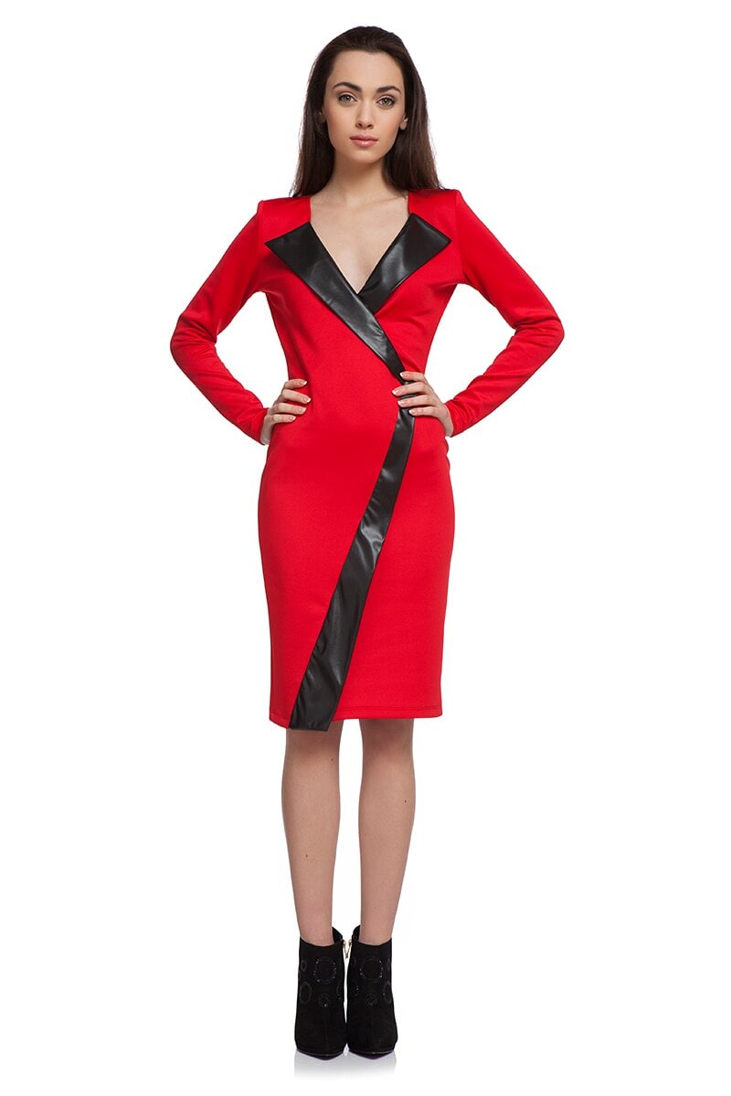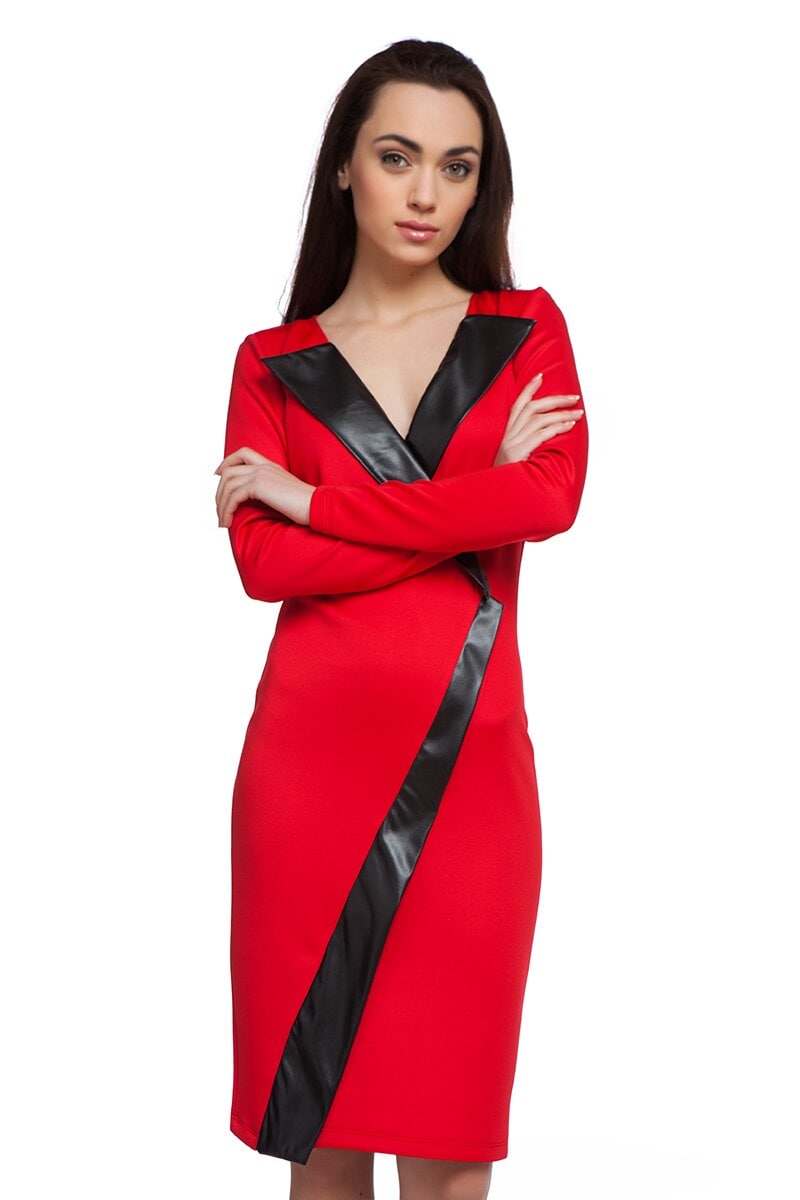 Ефектна червена рокля с втален силует и средна дължина с контрастиращ цвят на борда от еко кожа