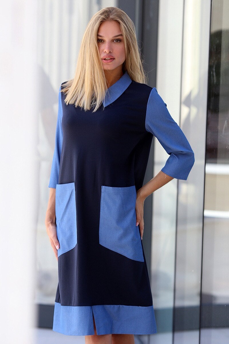 Рокля със свободен силует RIVER. Рокля от италианско пунто милано в съчетание с плат, имитиращ деним. Свободен силует