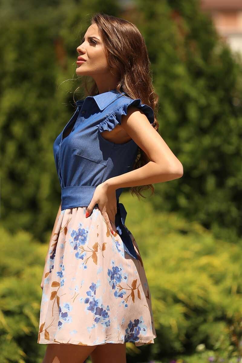 Кокетна къса рокля от два плата. Роклята е с леко втален силует, с колан за допълнително вталяване. Горната част е изработена от 100% памук - имитация на дънков плат, долната - коприна, с хастар. Закопчаване с копчета и скрит цип на гърба