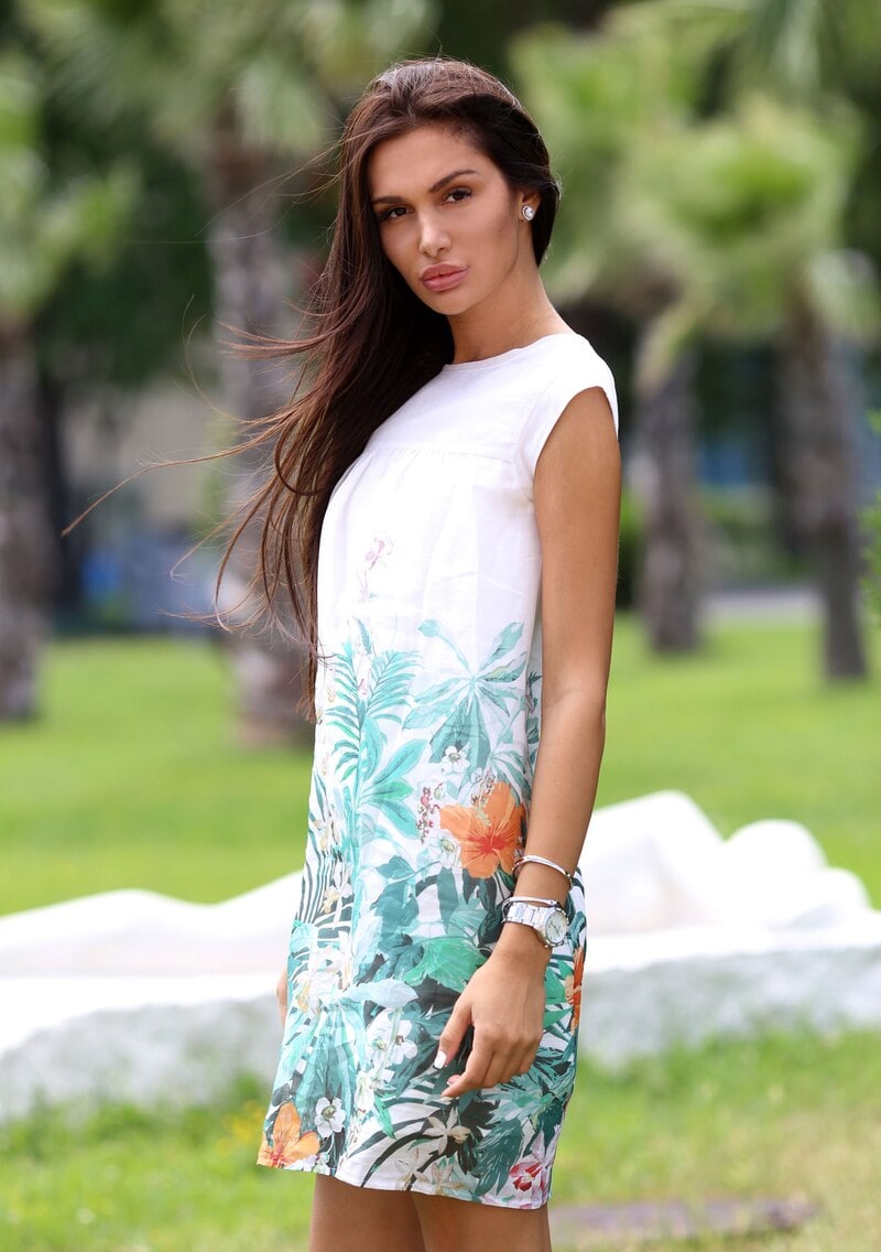 Стилна бяла рокля със свободен силует. Роклята е изпълнена от италиански лен с дизайнерски принт. Чудесен избор за официален повод, а също така и за ежедневието.